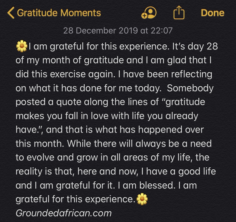 🌼I am grateful for this experience. It’s day 28 of my month of gratitude and I am glad that I did this exercise again. I have been reflecting on what it has done for me today. Somebody posted a quote along the lines of “gratitude makes you fall in love with life you already have.”, and that is what has happened over this month. While there will always be a need to evolve and grow in all areas of my life, the reality is that, here and now, I have a good life and I am grateful for it. I am blessed. I am grateful for this experience.🌼