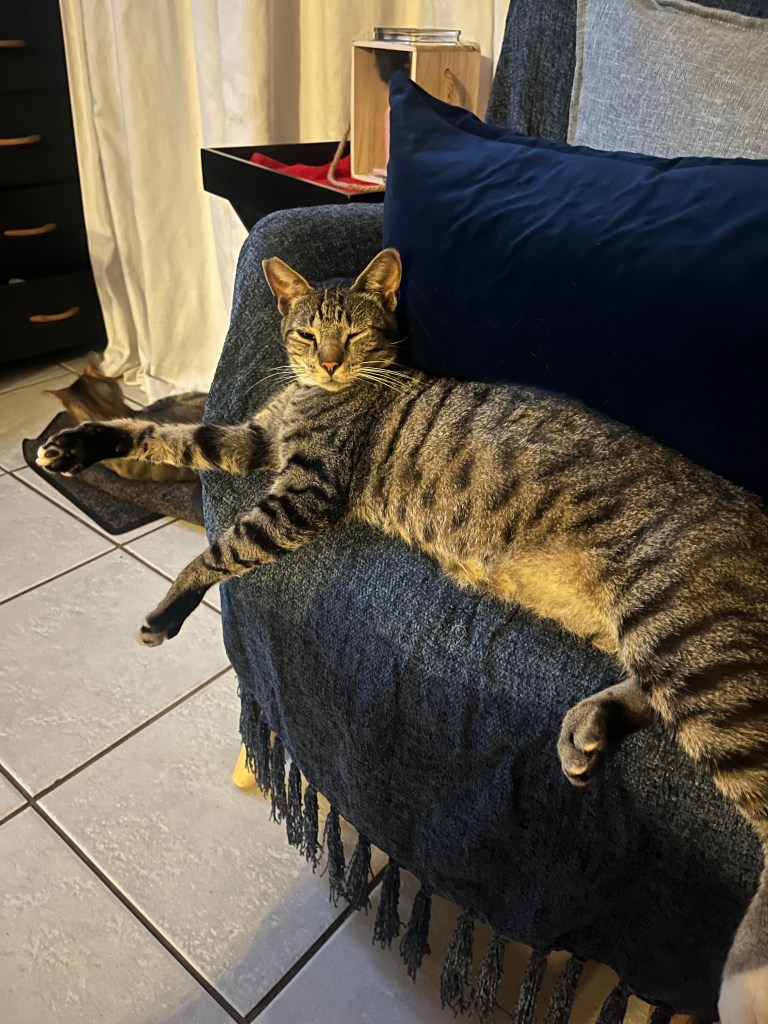 I will leave you with pic of one of the cats that have adopted me. I call him Fred. He is a feisty young cat who can be a bit of a bully. This evening, I caught him squeezing himself onto my chair he is not allowed on and then proceeding to have a good nap. He was not impressed when I woke him. 😜