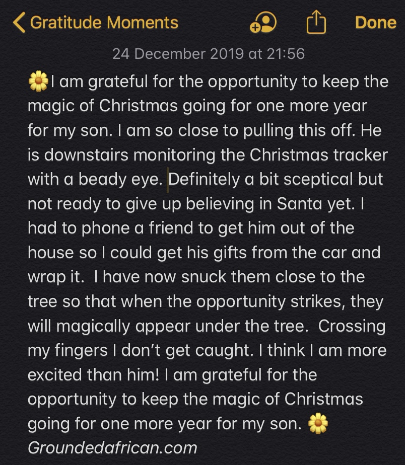 🌼I am grateful for the opportunity to keep the magic of Christmas going for one more year for my son. I am so close to pulling this off. He is downstairs monitoring the Christmas tracker with a beady eye. Definitely a bit sceptical but not ready to give up believing in Santa yet. I had to phone a friend to get him out of the house so I could get his gifts from the car and wrap it. I have now snuck them close to the tree so that when the opportunity strikes, they will magically appear under the tree. Crossing my fingers I don’t get caught. I think I am more excited than him! I am grateful for the opportunity to keep the magic of Christmas going for one more year for my son. 🌼