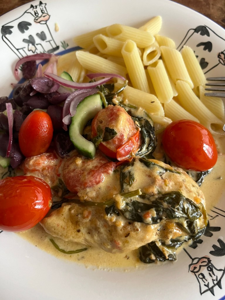 The dish I have enjoyed making and eating is called Creamy Tuscan Chicken. I found the the recipe on the internet. It’s quick and easy and tastes delicious. I serve it with pasta most often. The recipe doesn’t call for it but I add basil at the end which just helps to make it taste more fresh and not too creamy. You can find the recipe here.